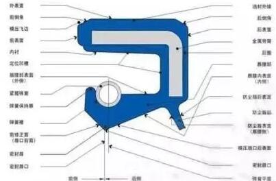 油封主要由密封體、加強骨架和自緊螺旋彈簧等幾部分組成。密封體按照不同部位又分為底部、腰部、刃口和密封唇等。下圖是:帶彈簧并附有防塵唇的內(nèi)包骨架油封各部位主要名稱和術(shù)語。