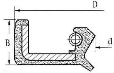 上圖中小d表示油封的內徑,大D表示油封的外徑,而B表示油封的高度。例:TC30*40*5,表示型式為TC(雙唇包骨架)內徑為30mm 外徑為40mm 高度為5mm的骨架油封。有時后面也可跟DIN,GB/T9877-88等表示油封所依據的標準。油封的內徑尺寸范圍一般在:Φ16~440mm,寬度常見為7~20mm。
