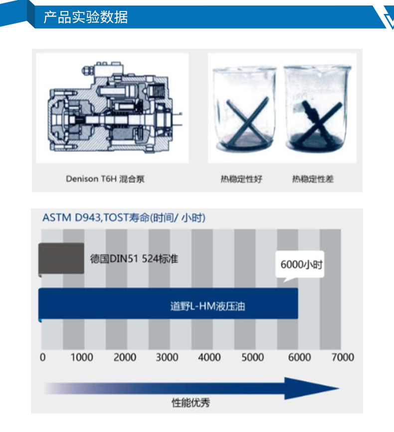 良好的熱穩定性=系統清潔,閥件卡阻少,適合高溫嚴苛工況,換油周期長。道野L-HM液壓油順利通過Cicinati測試,油泥僅為標準的五分之一。