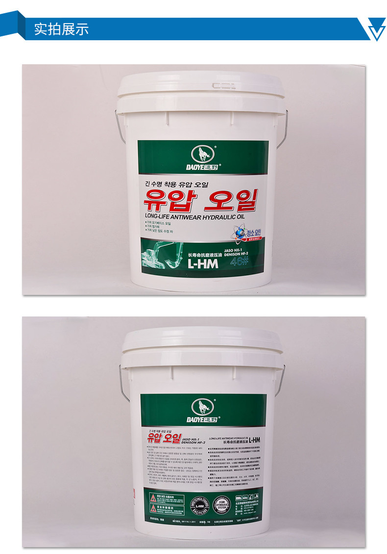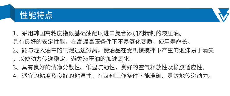 ●采用韓國高粘度指數基礎油配以進口復合添加劑精制的抗磨液壓油。
