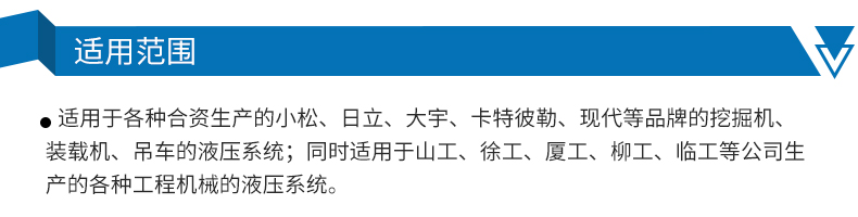 適用于各種進口及合資的小松、日立、大宇、卡特彼勒、現代等品牌的挖掘機、裝載機、吊車的液壓系統;同時適用于山工、徐工、廈工、柳工、臨工等公司的各種工程機械的液壓系統。
