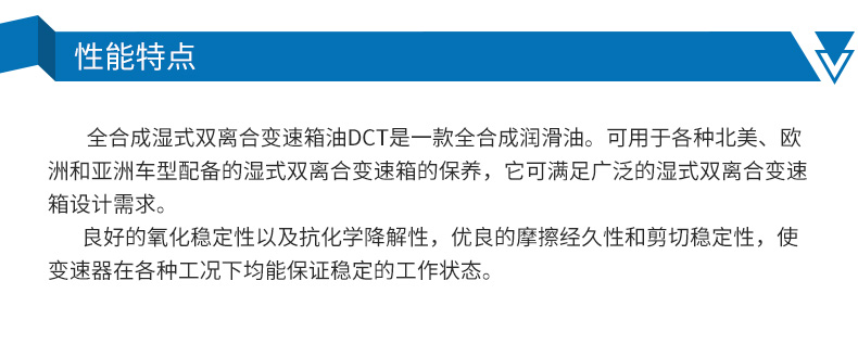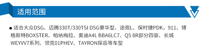 ●全合成濕式雙離合變速箱油DCT是一款全合成潤滑油可用于各種北美歐洲和亞洲車型配備的濕式雙離合變速箱的保養(yǎng),它可滿足廣泛的濕式雙離合變速箱設計需求。適合大眾DSG、邁騰330T/30TS|DSG豪華型、途觀L、保時捷PDK,11、博格斯特 Boxster、帕納梅拉、奧迪A4LB8A6C7、Q58R部分四驅、長城wEYw7全系列、領克01PHEV、 TAYRON探岳等車型。