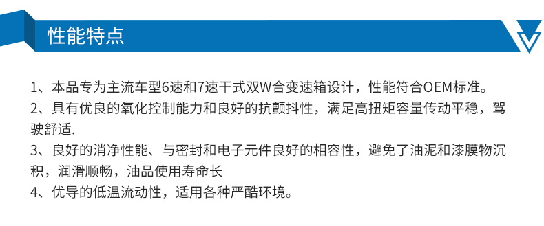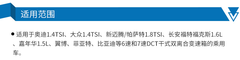 ●本品專為主流車型6速和7速干式雙離合變速箱設計,性能超越OEM標準。具有優異的抗磨保護、氧化控制能力和岀色的抗顫抖特性,滿足髙扭矩容量,傳動平穩,駕駛舒適。適用于進口奧迪14TS、大眾1.4TS、新邁騰/新帕薩特1.8TS、長安福特??怂?.6L,嘉年華1.5、翼博、菲亞特、比亞迪等6速和7速DCT干式雙離合箱。