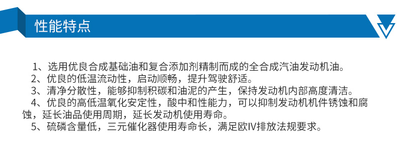 ●選用進口合成基礎油和進口復合添加劑精制而成的全合成汽油發動機油。 ●優異的低溫流動性,啟動順暢,提升駕駛舒適。 ●清凈分散性,有效抑制積碳和油泥的產生,保持發動機內部高度清潔。 ●優異的高低溫氧化安定性,酸中和性能力,有效抑制發動機機件銹蝕和腐蝕,延長油品使用周期,延長發動機使用壽命。 ●硫磷含量低,三元催化器使用壽命長,滿足歐IV排放法規要求。