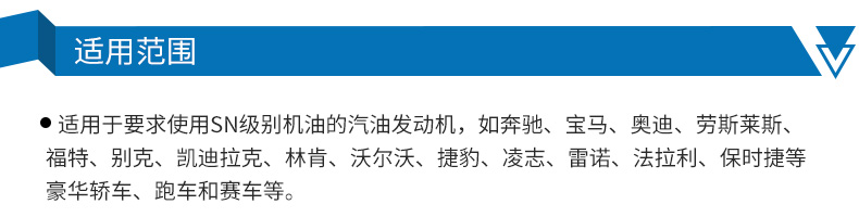 ●適用于要求使用SN級別機油的汽油發動機,如奔馳、寶馬、奧迪、勞斯萊斯、福特、別克、凱迪拉克、林肯、沃爾沃、捷豹、凌志、雷諾、法拉利、保時捷等豪華轎車、跑車和賽車等。