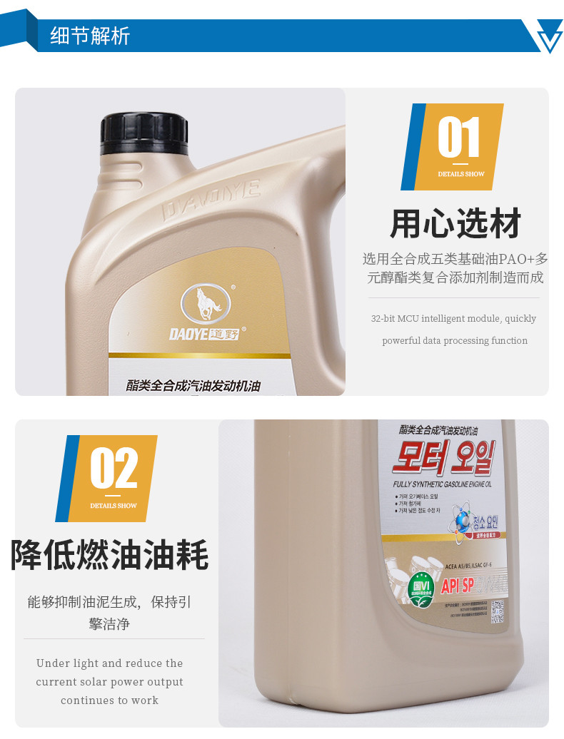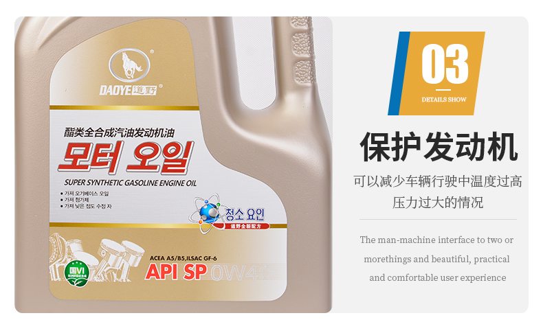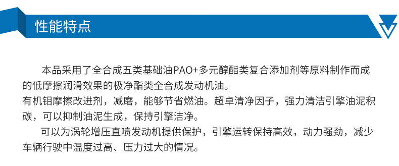 ●選用進口合成基礎油和進口復合添加劑精制而成的全合成汽油發動機油。 ●優異的低溫流動性,啟動順暢,提升駕駛舒適。 ●清凈分散性,有效抑制積碳和油泥的產生,保持發動機內部高度清潔。 ●優異的高低溫氧化安定性,酸中和性能力,有效抑制發動機機件銹蝕和腐蝕,延長油品使用周期,延長發動機使用壽命。 ●硫磷含量低,三元催化器使用壽命長,滿足歐IV排放法規要求。
