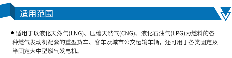 ●適用于以液化天然氣(LNG)、壓縮天然氣(CNG)、液化石油氣(LPG)為燃料的各種燃氣發動機配套的重型貨車、客車及城市公交運輸車輛,還可用于各類固定及半固定大中型燃氣發電機。